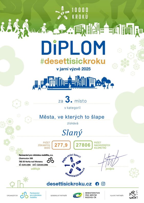 Město Slaný slaví úspěch v celorepublikové jarní výzvě 10 000 kroků, kde se umístilo na 3. místě ve své kategorii měst. Do výzvy, která probíhala po celý duben, se zapojily tisíce účastníků z více 70 měst a obcí, kteří dohromady nachodili miliony kroků. Slánští tak potvrdili, že chůze je pro ně nejen zdravý pohyb, ale i způsob, jak budovat komunitního ducha.
