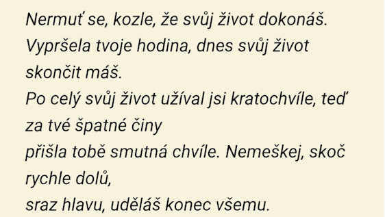 Na střeše udělali lešení a tam kozla vyvedli. Některý chasník četl mu ortel, jsa přistrojen za „kata“. Udělán testament. Kůže doporučena sousedům na kalhoty, maso hospodyním do kuchyně na pekáč, střeva hudebníkům na struny, rohy na špičky k dýmkám nebo dětem na troubení, mládencům nožíčky, aby dobře v tanci poskakovali, drob a držka muzikantům, loj mládencům na boty a podobně dále. Při zabíjení chytali lidé krev a dávali ji píti tomu, kdo měl padoucí nemoc nebo píchání. (časopis Květy, č.8, 1897)