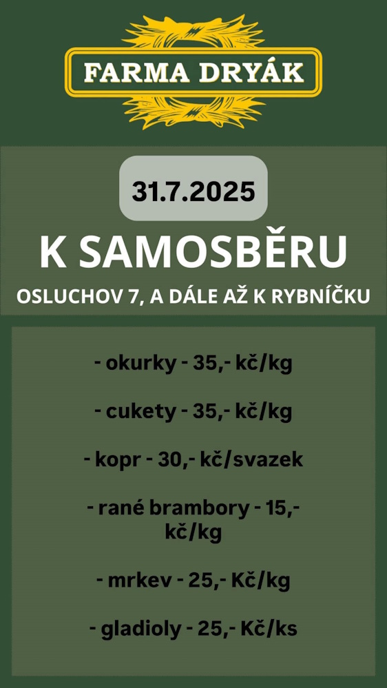Jedním z lákadel Farmy Dryák je možnost samosběru, která je velmi oblíbená. Návštěvníci si tak mohou sami nasbírat čerstvé ovoce či zeleninu přímo z pole a zažít autentický zážitek z farmaření.