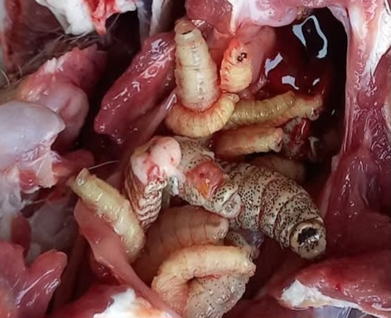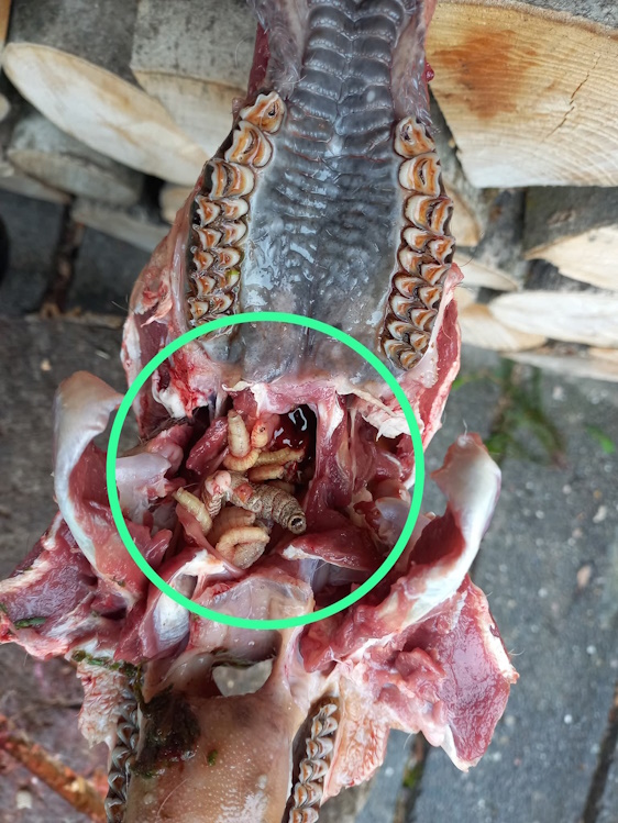 Pro myslivce je typické, že při vyvrhování nalezne ve střevech, nosních dutinách nebo pod kůží larvy bílé až žlutavé barvy, velikosti několika centimetrů.
