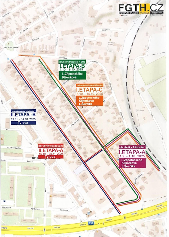 II. Etapa A: od 15.10. 2025 – do 23.11. 2025 úplná uzavírka ul. Tylova (v úseku od křižovatky s ul. Vítězná do křižovatky s ul. Karla Kindla), včetně navazující úplné uzavírky části ul. Ladislava Ševčíka (v úseku od křižovatky s ul. L. Zápotockého do křižovatky s ul. Tylova), pro stavební práce spojené s rekonstrukcí komunikace –frézování a silniční obrubníky, v této etapě mohou rezidenti vjet do své nemovitosti, parkování v uzavírce nebude umožněno.