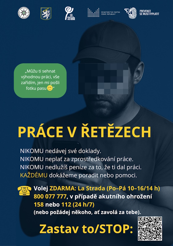 Projekt s názvem „Práce v řetězech“ se zaměřuje na problematiku obchodování s lidmi, což je nejzávažnější forma trestné činnosti ohrožující lidská práva, svobodu a integritu a staví oběti na úroveň věcí. Tato trestná činnost cílí na rozmanitou skupinu obyvatel a využívá stále sofistikovanější způsoby nátlaku na oběť s úmyslem je vykořisťovat. Této problematice nahrává mimo jiné nelegální migrace, politická situace ve světě, ekonomická nestabilita či nízká finanční gramotnost. Pachatelé využívají zejména důvěřivosti, tíživé sociální situace a neznalosti právního prostředí. Oběti (nejen ze zahraničí, ale i z České republiky) se tak často ocitají v situaci, kdy jsou zbaveny základních práv, zadluženy a nuceny vykonávat práci či poskytovat služby pod hrozbou násilí nebo jiné újmy. Součástí projektu jsou informační materiály, video a spolupráce s partnery, které poskytují pomoc obětem.