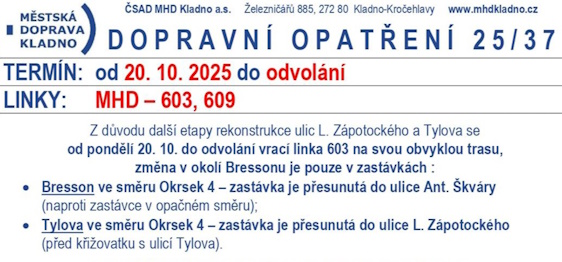 S ohledem na postupující rekonstrukci ulic L. Zápotockého a Tylova se od pondělí 20. října do odvolání vrací linka 603 na svou obvyklou trasu. Přesun se týká pouze zastávek Bresson a Tylova.