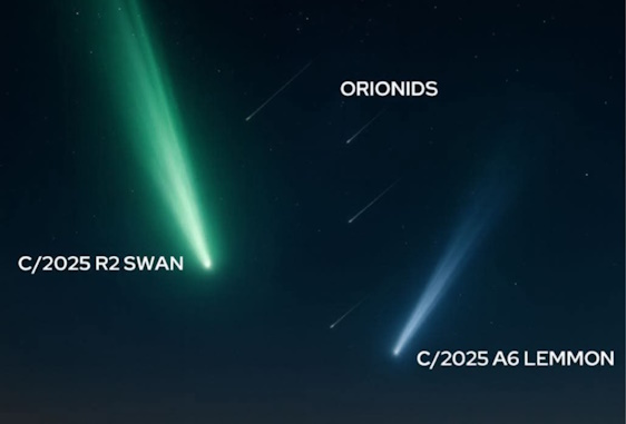 - Kometa C/2025 A6 (Lemmon): Ta je aktuálně (říjen 2025) v období největší jasnosti a je pozorovatelná. Tu můžeme pozorova znovu za víc než 1000 let.