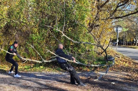 Oznámení o padlém stromu přes komunikaci v ulici Sportovců dostali strážníci před půl jednou odpoledne. Problém byl ale vyřešen díky pohotové reakci pracovníků z nedaleké stavby v Petrohradské ulici. Jeden ze zaměstnanců sem přijel traktorbagrem a kmen odstranil ke kraji vozovky. Strážníci tak pouze poskytli asistenci hasičům, kteří vozovku dočistili od větví.