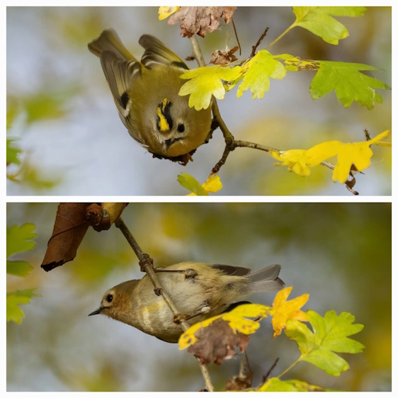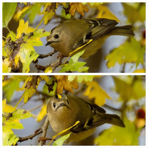 Zářivá korunka: U samce je korunka uprostřed oranžová, zatímco samice má celou skvrnu citronově žlutou. Sameček ji dokáže při toku vztyčit.