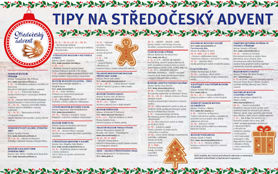 Návštěvníci se mohou těšit na výstavy historických i současných betlémů v Hornickém muzeu Příbram, Muzeu zlata v Novém Kníně či v Muzeu Hořovicka. Skanzeny ve Vysokém Chlumci, Přerově nad Labem a Kouřimi oživí lidové vánoční zvyky, ukázky řemesel, obchůzky Mikuláše a Barborek i tematické dílny. Řadu akcí doplní koncerty, divadlo, únikové hry nebo designové trhy – například v GASK či ve Středočeském muzeu v Roztokách.