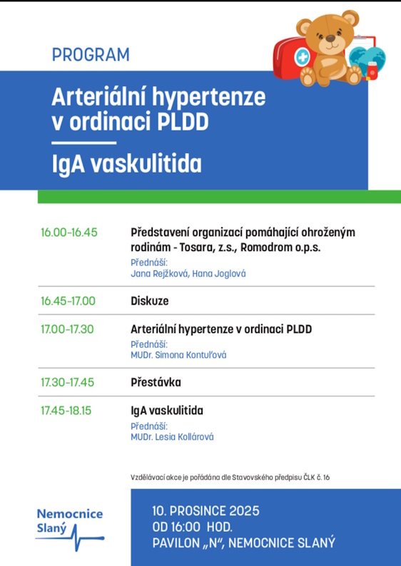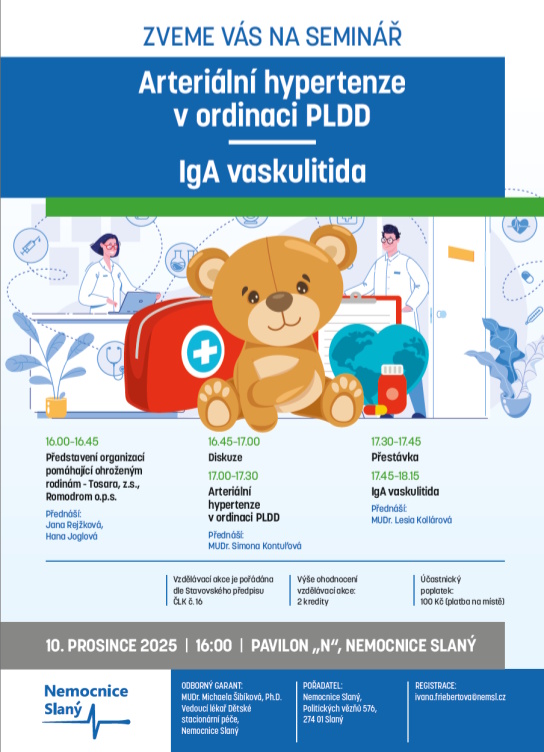 Nemocnice Slaný uzavře letošní sérii vzdělávacích seminářů prosincovým setkáním zaměřeným na arteriální hypertenzi a IgA vaskulitidu v dětském věku. Semináře jsou určeny především praktickým lékařům pro děti a dorost, sestrám, porodním asistentkám, ale také pracovníkům rané péče či pedagogům mateřských škol a dalším profesím, které přicházejí do kontaktu s dětmi.
