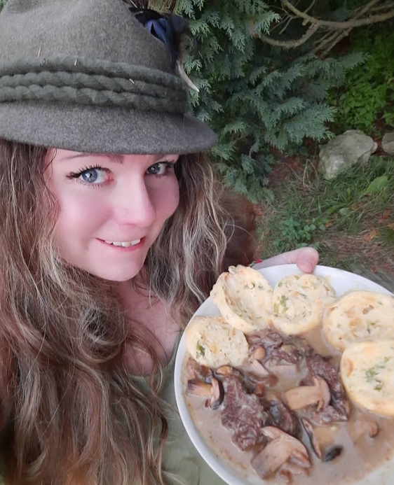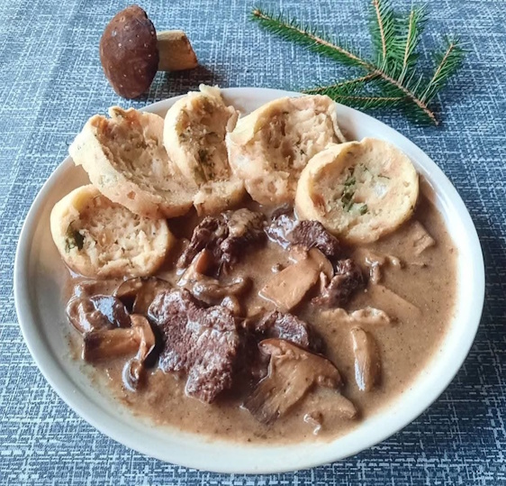 Večer, když venku vítr hvízdá v korunách a oheň praská v krbu, nakrájím rohlíky na kostičky a dám je na deset minut vyschnout do vyhřáté trouby. Po vyndání k nim nasypu nasekanou petrželovou nať. Do druhé nádoby přidám žloutky, mléko a hrubou mouku a udělám těstíčko. Z bílků vyšlehám sníh a všechny suroviny opatrně smíchám. Na knedlík se mi nejlépe osvědčil igelitový pytlík na tlačenku, který směsí naplním a dám vařit do vroucí vody a vařím cca 20minut. Vyndám, nakrájím a přidám maso. Zda omáčku dáte na knedlíky a nebo vedle už nechám na vás. Na talíři se spojí to nejlepší z lesa a domácí kuchyně.