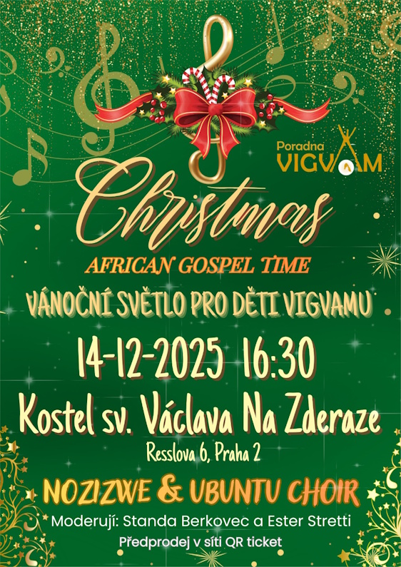 Čeká vás jedinečné africké gospelové vystoupení, které přinese radost, energii, rytmus a lásku. Společně rozsvítíme Vánoční světlo pro děti Poradny Vigvam — světlo, které pomáhá tam, kde život zanechal tmu.