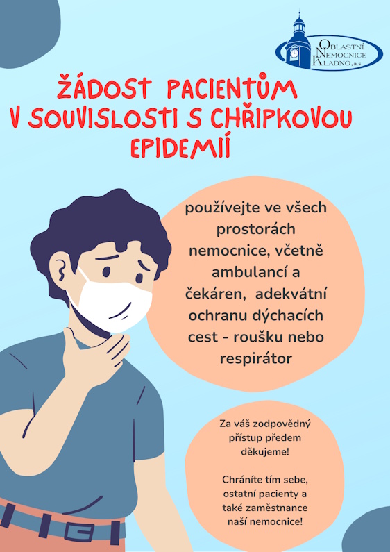 Pacienty s příznaky respiračního onemocnění (rýma, kašel, bolest v krku, zvýšená teplota apod.) žádáme o striktní používání ochrany dýchacích cest ve všech prostorách nemocnice, včetně čekáren, ambulancí a společných prostor.