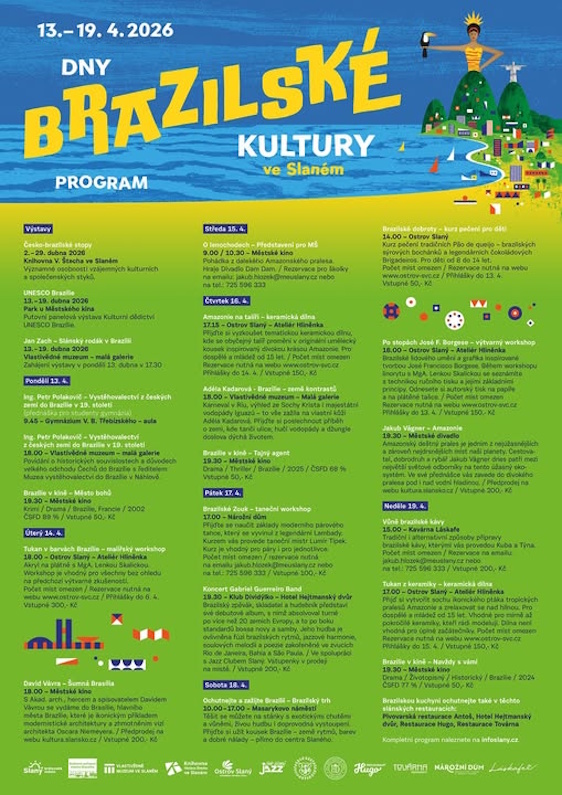 Vše pak vyvrcholí v sobotu 18. dubna na Masarykově náměstí. Velký Brazilský trh zaplní centrum města exotickými chutěmi, trhovci a nefalšovanou karnevalovou náladou.Přijďte se ohřát v paprscích brazilského slunce přímo ve Slaném. Tohle bude týden, kdy se nikdo nebude nudit!