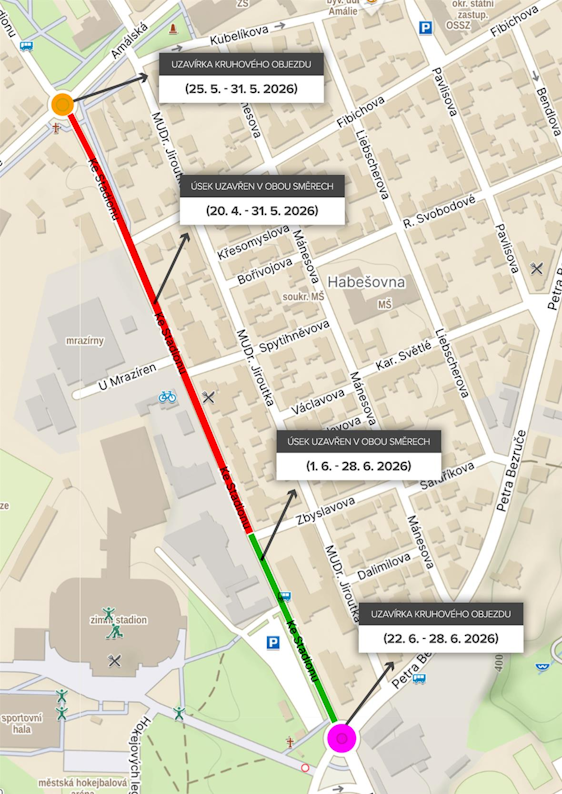 20. 4. – 24. 5. 2026 – uzavírka úseku Fr. Kloze x Zbyslavova – okružní křižovatka u „Amálky“ bude průjezdná.